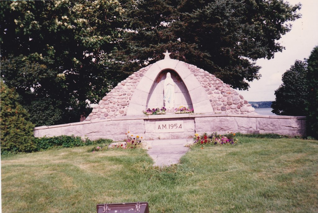 La « grotte », de nos jours… la structure de pierres tout autour a été ajoutée lors du 250e anniversaire de la paroisse en 1963.