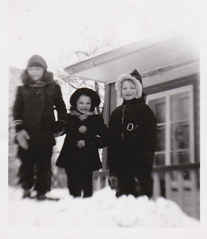 Moi et deux fillettes du voisinage, Nicole Paquin et Anita Marchand, devant la maison de M. Laplante.