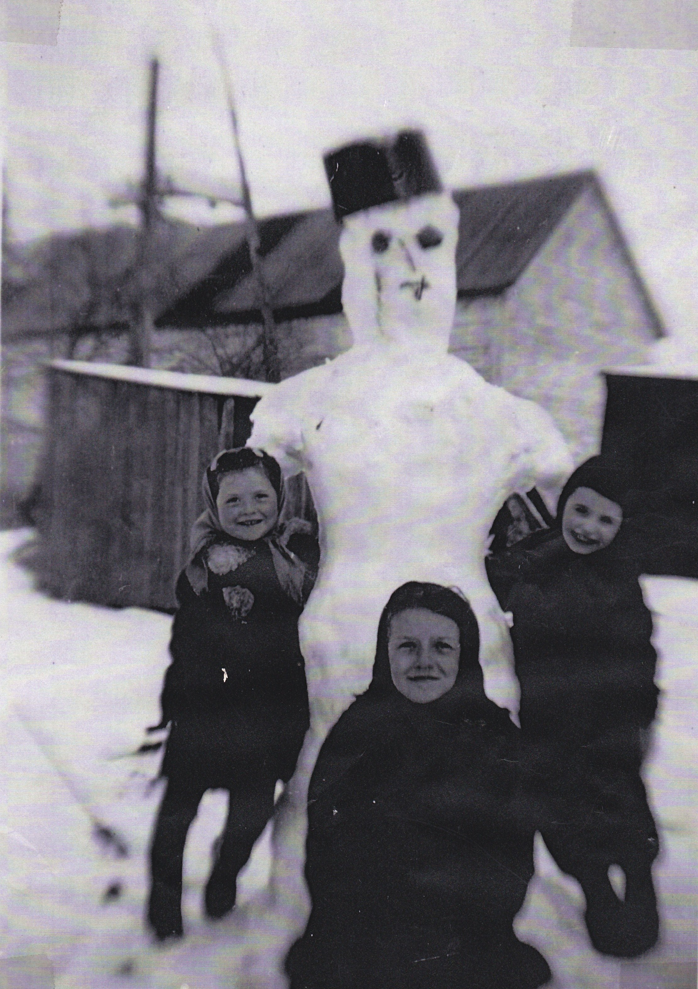 Quand la neige est « mottante », comme on disait dans le temps, il n’y a pas de plaisir qui égale celui de faire un beau bonhomme de neige. Avec mes amies Colette et Madeleine, nous en avions fait un; d’après mes souvenirs, nous y avions mis beaucoup de temps. Il n’était pas rond, comme la plupart de ses pareils, c’était un grand bonhomme élancé, la taille fine… Pour qu’il soit encore plus grand, il avait une chaudière rouge sur la tête. Heureusement, Madeleine était grande, car Colette et moi n’aurions jamais été capables de finir la tête! Cette photo a été immortalisée sur une toile de Colette, qui est peintre; elle y a ajouté un petit chien… comme elle le fait sur presque toutes ses œuvres.