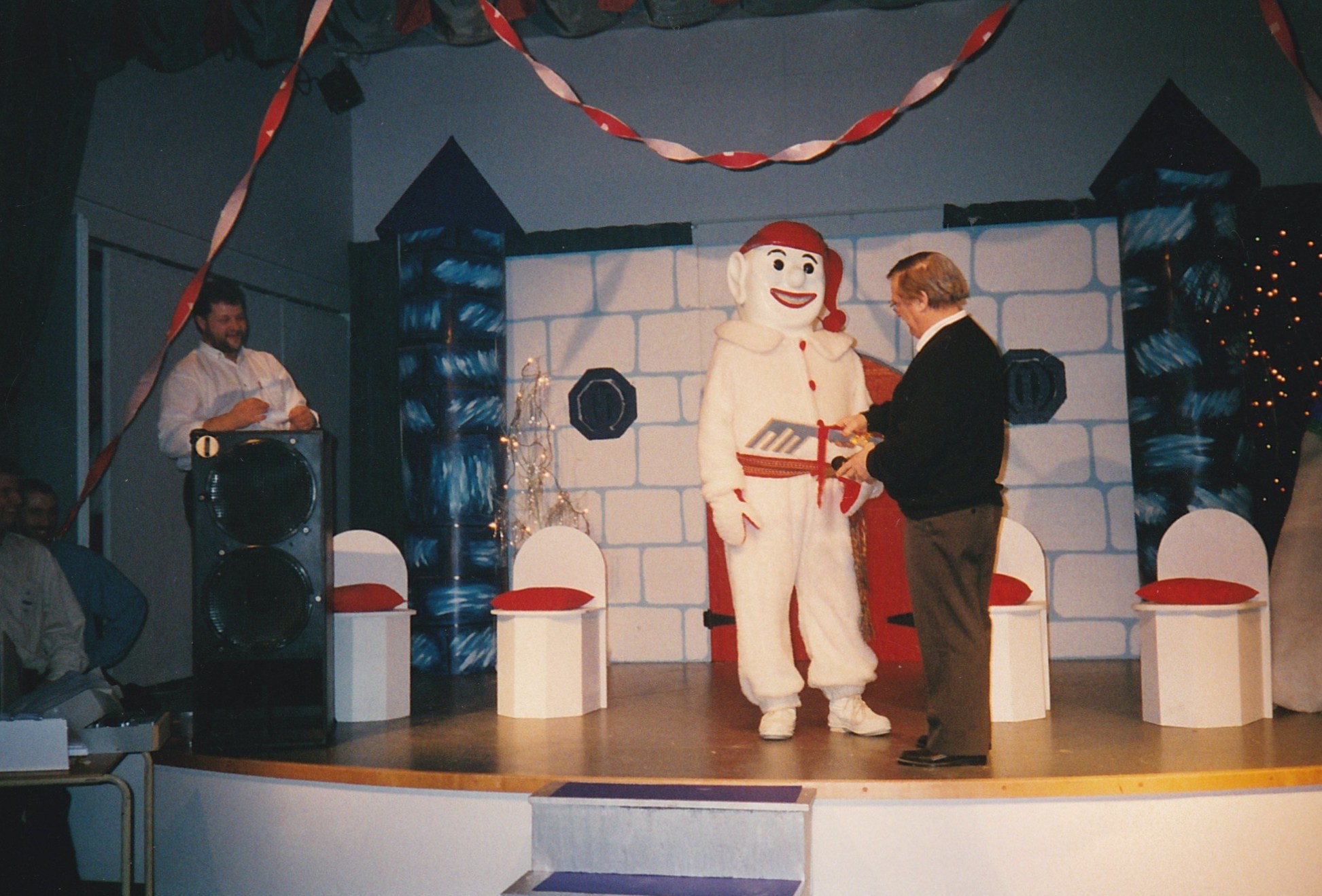 Dans mon livre Propos d’hiver et de Noël, dans le texte Au temps du ballon-balai, j’évoque aussi les carnavals de l’O.T.J. Je n’ai pas de photos de ces activités carnavalesques et des bals avec les duchesses et les intendants, et c’est vraiment dommage; elles avaient beaucoup d’allure nos duchesses vêtues de leur costume de sport ou de leur robe de bal. Dans les années 90, après une éclipse de presque vingt ans, le Club Optimiste a fait revivre pour un temps le carnaval d’hiver. On voit ici une soirée carnavalesque en 1995, les sièges des duchesses sont encore vides… mais on peut voir le maire qui remet les clés de la municipalité au Bonhomme Carnaval, selon la coutume!