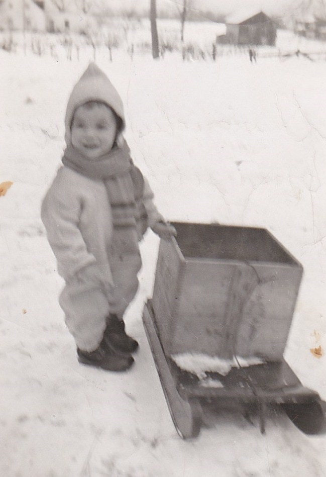 Quand on avait des vieux skis cassés, s’ils étaient d’une certaine longueur, on les coupait, on y clouait une bûche – écorcée ou non, et une planche de travers qui servait de banc; et voilà! On avait un « traîne-fesse » ou un « branle-cul », si le mot ne vous offusque pas. C’est dommage, je n’ai malheureusement pas de photo de ce bolide qui amusait une bonne partie des jeunes de mon époque. Chose certaine, on était inventif dans le temps, il n’est que de voir le superbe petit traîneau dans lequel on promenait mon petit frère qui avait à peine deux ans sur la photo; une « boîte à beurre » fixée solidement sur un petit traîneau, ça faisait l’affaire!