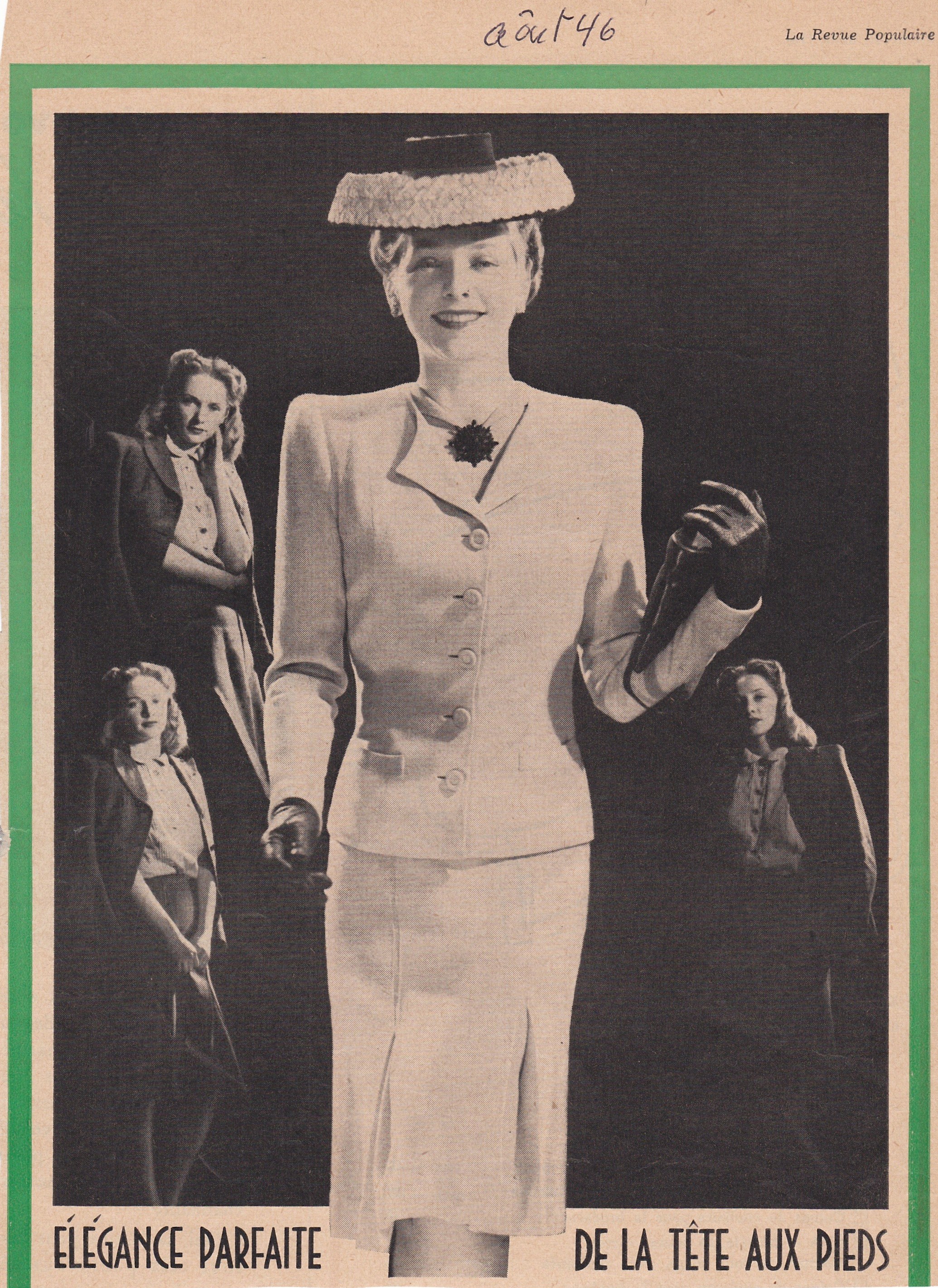 La mode a toujours eu de ces extravagances…. dans les magazines, on voit des choses que moi je ne trouve absolument pas portables. Mais il y a 50 ans et plus, la mode nous imposait aussi ses bizarreries. Par exemple, passé le 15 août, on rangeait les chapeaux de paille ainsi que les accessoires blancs, et cela même s’il faisait aussi chaud sinon plus qu’en juin. On sortait les chapeaux de velours ou de feutre et les accessoires noirs ou bruns. Au printemps, on faisait l’inverse. À Pâques, on sortait le tailleur de couleur pastel et un chapeau de paille, autant que possible avec profusion de fleurs, et cela même s’il gelait ou s’il neigeait! Vous voyez sur cette photo une image découpée dans la Revue Populaire d’avril 1946. Aimez-vous le chapeau, style « tarte »? C’était ça, la mode!