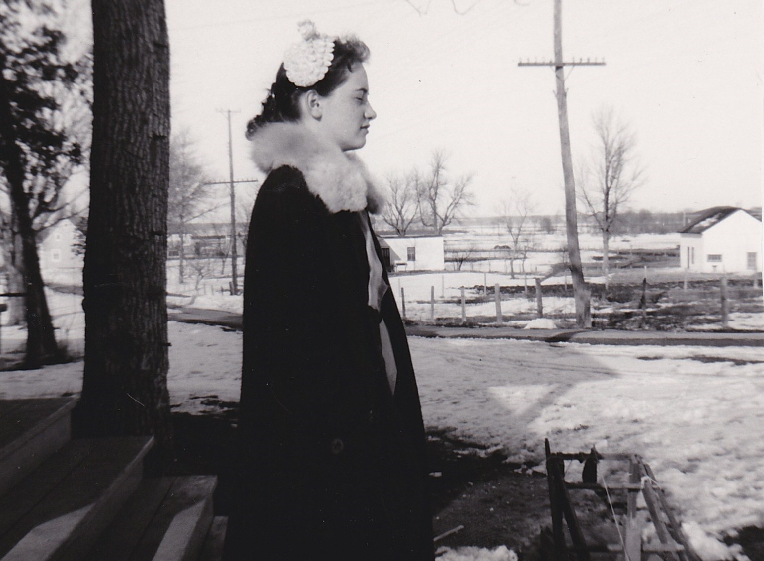 La photo date de 1955. Elle a été prise le jour de Pâques. Vous voyez ce que ça donne un chapeau de paille avec un manteau d’hiver! J’étrennais ce petit chapeau qui était rose. J’étais supposée le porter avec mon manteau de printemps qui était beige. Pâques tombait comme cette année à la fin de mars. Je sortais d’un de mes interminables rhumes… et maman avait dit : « Non! Tu mets ton manteau d’hiver, il fait pas assez chaud pour sortir ton manteau de printemps. D’ailleurs tout le monde est encore habillé en hiver! » Je boudais et je ne voulais pas que ma sœur prenne la photo. Pour me donner le bon exemple, elle s’était fait photographier avec son manteau gris – celui d’hiver, et son chapeau de paille blanc. Mais moi, je trouvais qu’avec le col en fourrure (du lapin ou je ne sais quoi), le chapeau de paille avait l’air incongru. Un de mes frères, qu’on ne voit pas… tente de me faire rire et je ne veux pas. En plus la photo a été prise après la messe, juste avant dîner; étant ainsi face au soleil, j’ai fermé les yeux… Pour moi, c’est une photo qui parle beaucoup!