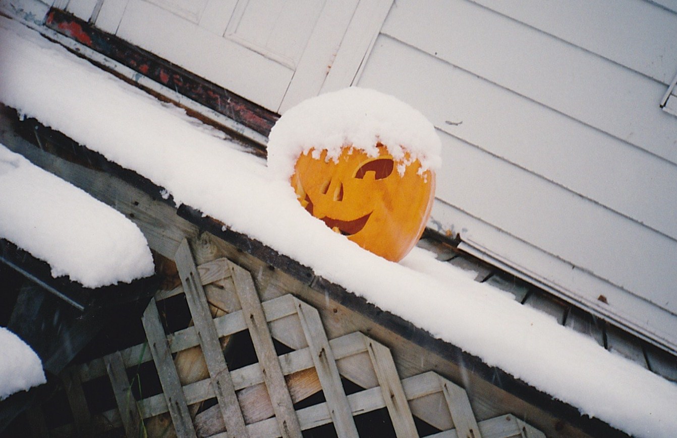 J’aime bien cette photo d’une citrouille d’Halloween décorée d’un chapeau de neige. C’était le premier jour de novembre et on s’était réveillés dans un paysage tout blanc! Pourtant, la veille, un dimanche, il faisait beau et on avait reçu plusieurs petits monstres. Cette année-là nous avions fêté l’Halloween le samedi 30 octobre, au Moulin de La Chevrotière… un endroit sans aucun doute visité par les fantômes, enfin c’est ce que nous avions fait croire à ceux qui étaient venus fêter avec nous!