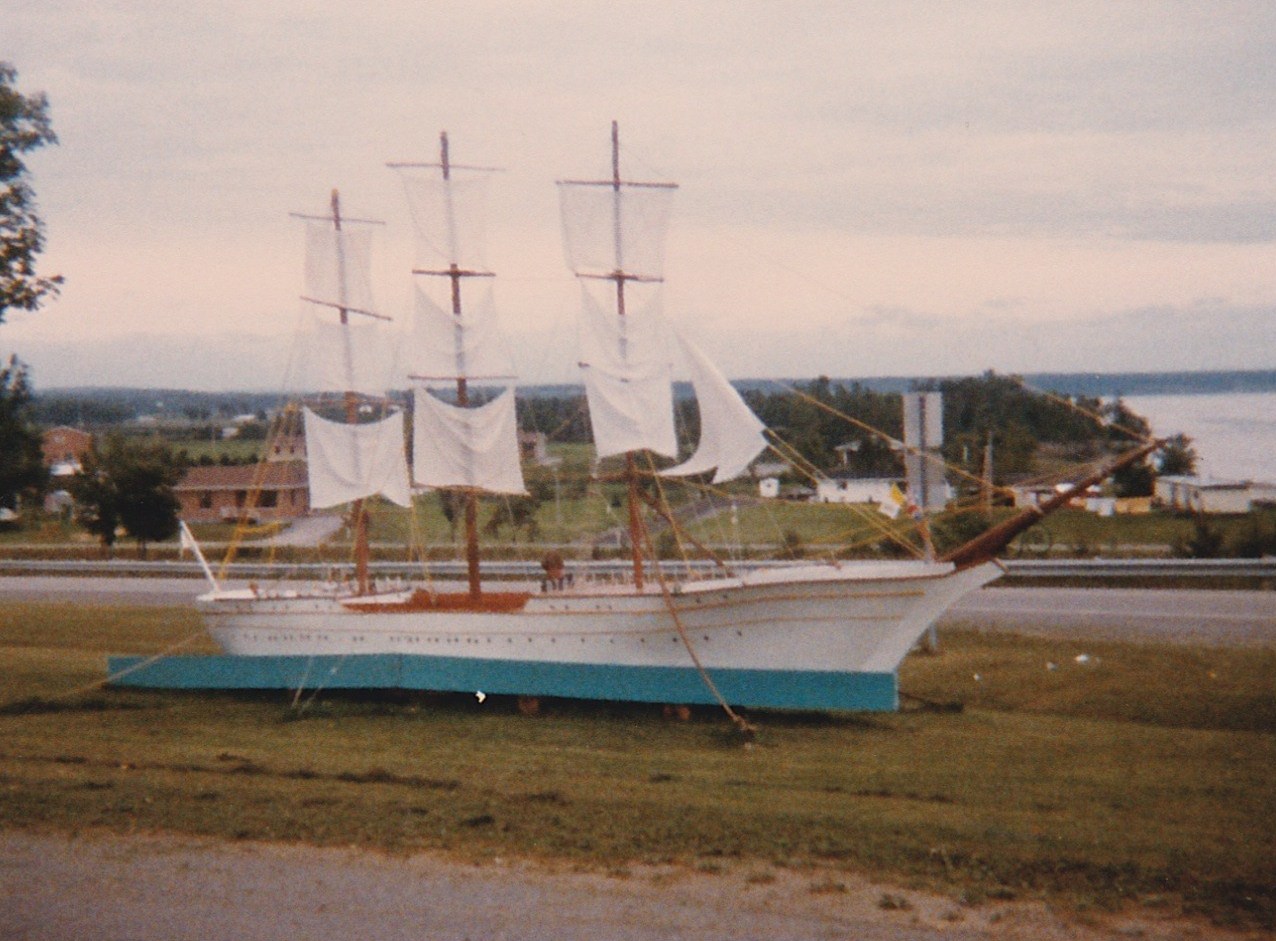 C’était l’année de « Québec, Mer et Monde ». De nombreux et magnifiques voiliers étaient venus d’un peu partout. Certains avaient remonté le fleuve jusqu’à Montréal. Au Vieux Presbytère, on présentait une exposition sur le fleuve, avec une maquette artisanale représentant le fleuve devant notre village. C’était fabriqué avec les moyens du bord, comme on faisait dans le temps, mais c’était quand même captivant, autant pour les gens d’ici que ceux d’ailleurs qui s’intéressaient à la vie maritime. Ce voilier, installé sur le terre-plein à l’entrée est du village, avait été fabriqué par M. Guy Savard, un marin retraité qui vivait alors à Deschambault.