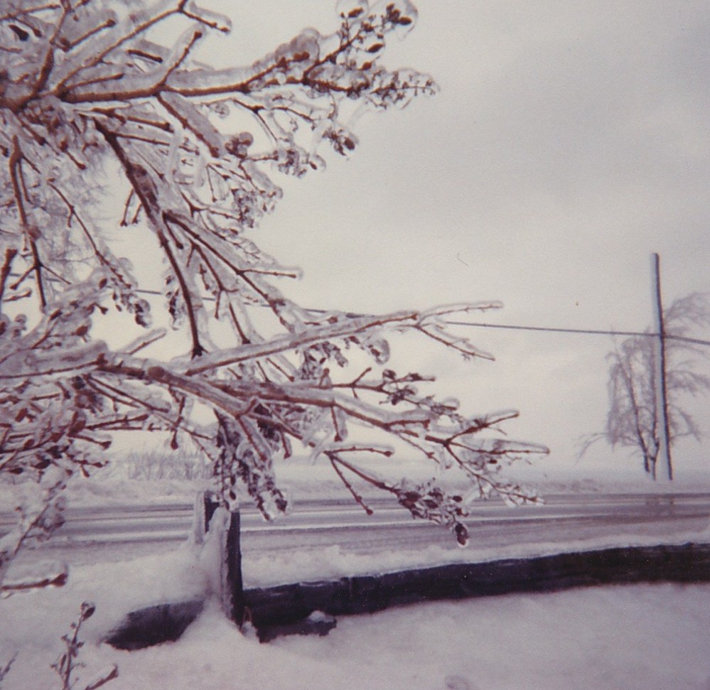 Le verglas du 3 décembre 1983. Il y en a eu des verglas, mais comme celui-là, je crois que je n’en ai jamais vu. Même pas lors de celui de 1998. Regardez bien la photo, vous remarquerez l’épaisseur de la couche de verglas sur les branches. Nos pauvres arbres avaient l’air piteux, leurs branches alourdies traînant jusqu’à terre… Les enfants étaient heureux : ils avaient eu congé d’école deux jours si je me souviens bien.