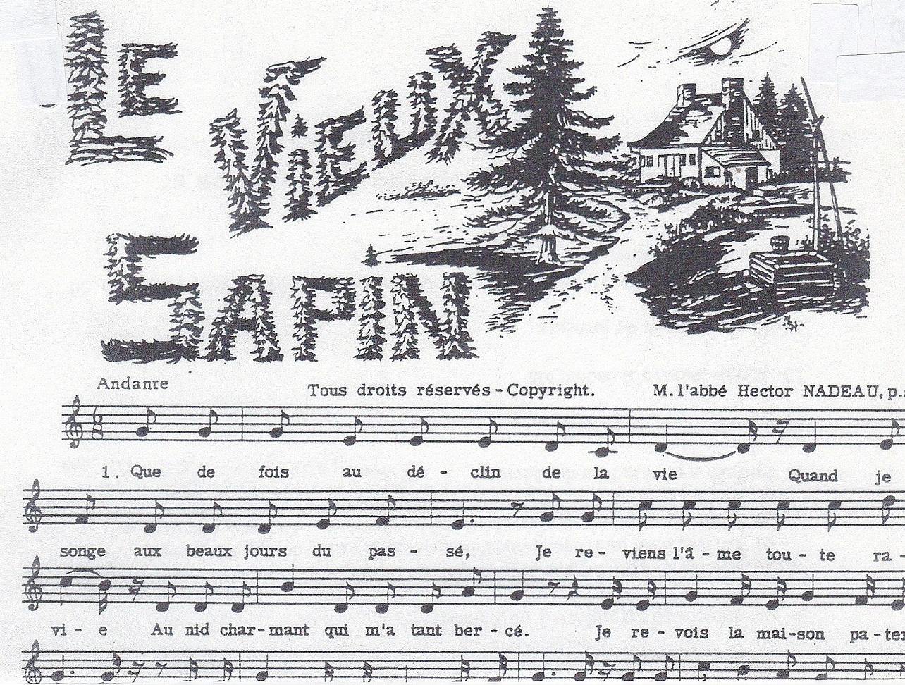 À chaque fois que j’ai dans la tête l’air du Vieux sapin, c’est à l’orme de notre vieille route que je pense. La chanson commence ainsi : « Que de fois au déclin de la vie, quand je songe aux beaux jours du passé… je reviens l’âme toute ravie, au nid charmant qui m’a tant bercé. » Tous ceux et celles qui ont grandi avec les Cahiers de La Bonne Chanson de l’abbé Gadbois, connaissent cette chanson. C’est une musique qu’on retient facilement et le refrain a juste assez de nostalgie pour qu’on s’y attarde… faisant ainsi des notes noires là où il y a des croches et des notes blanches où il y a des noires!