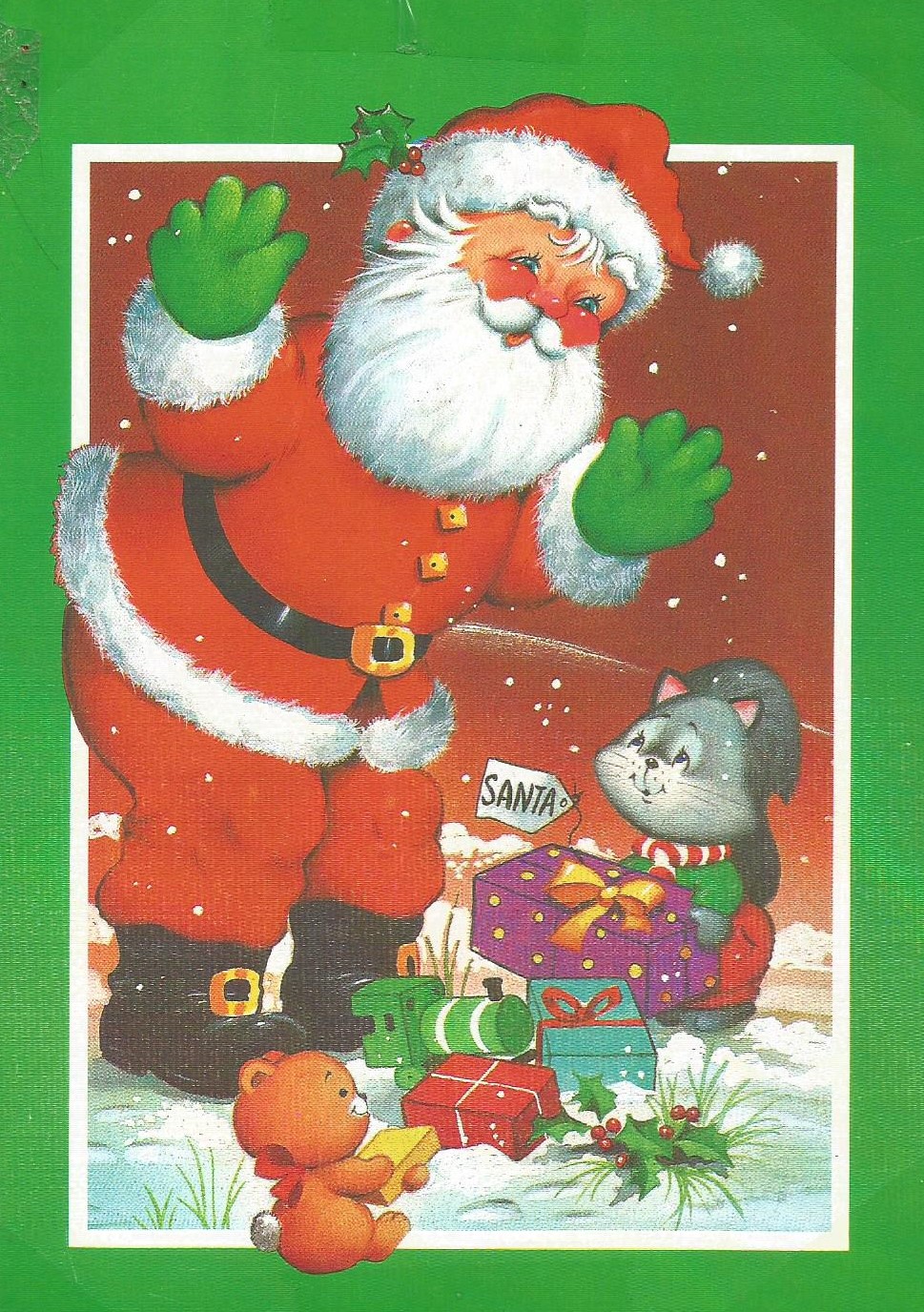 Sur les cartes, on voit des paysages d’hiver, des Pères Noël avec ou sans traîneau, des cloches, du gui. Sur certaines sont reproduites des images représentant la Nativité, la visite des bergers ou celle des Mages. Plusieurs cartes ornées d’images enfantines sont défraîchies; elles ont sans doute été collées sur le mur en guise de décoration, dans la chambre de l’un ou l’autre de mes enfants. Les messages imprimés souvent se ressemblent : « En ce temps de réjouissance et de paix »… « Pour un Noël joyeux et une année remplie de bonheur et de paix »… « Que la paix soit dans vos cœurs en ce jour de Noël et pour toute l’année. » La paix, toujours, sur un fond de neige, avec un ciel étoilé… Un rêve qui revient chaque année!