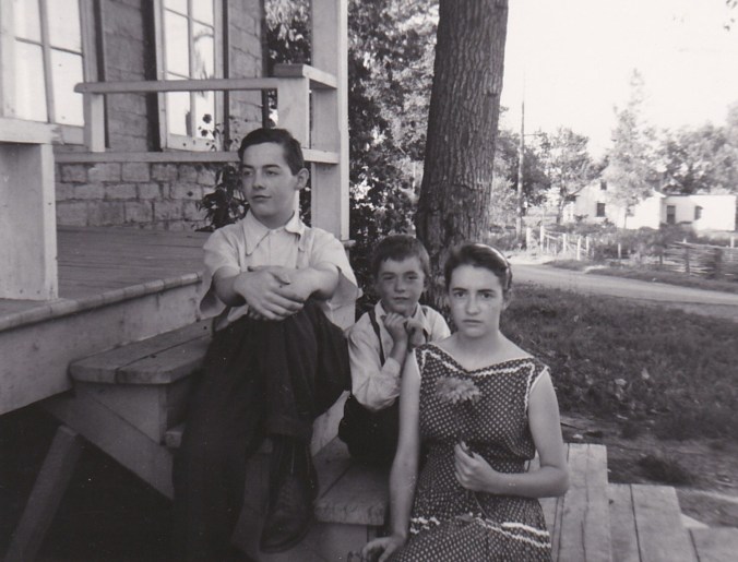 Mes frères Florent et Roger, et moi, vers 1955. La maison à l’arrière plan est celle de feu Jean-Yves Vézina