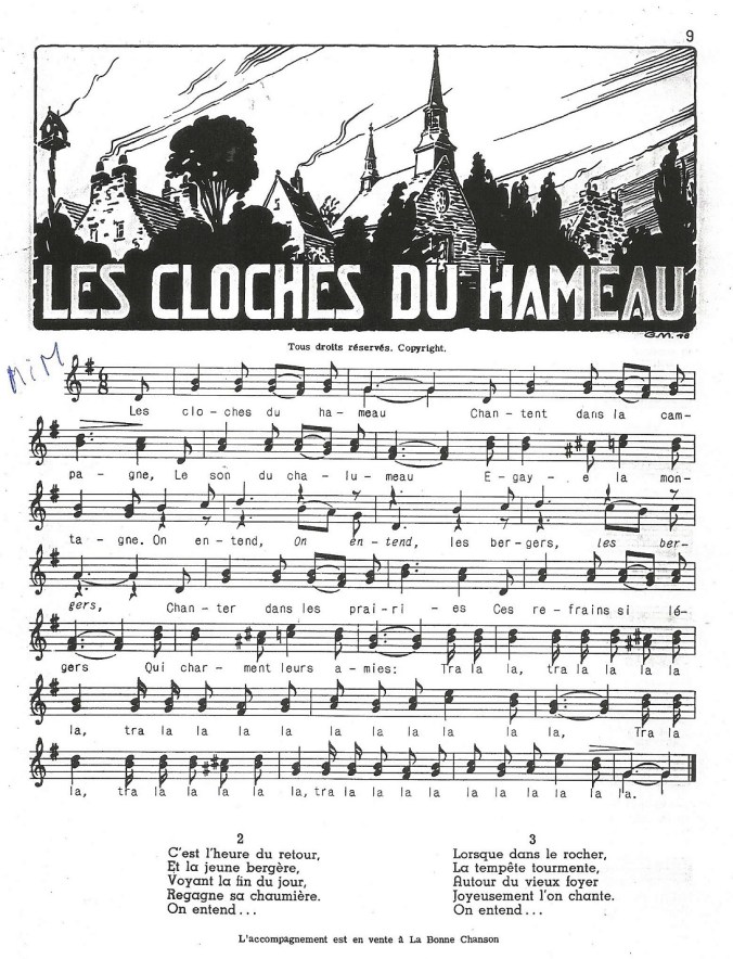 Certaines chansons revenaient souvent; ainsi en était-il de celles que tout le monde connaît, dont : Partons, la mer est belle. Tout le monde reprenait en chœur le refrain : « Partons, la mer est belle, embarquons-nous pêcheurs. Guidons notre nacelle, ramons avec ardeur… » Et que dire de Mon chapeau de paille, qui raconte l’histoire d’un patriote de la région du Richelieu en 1837 : « À Saint-Denis, près des grands bois, un jour d’orage et de bataille…je mis pour la première fois mon chapeau de paille… Sans égard pour mon beau chapeau, contre l’ennemi, la canaille, nous nous battîmes sans repos… en chapeau de paille ». Comme elles sont belles ces chansons qui racontent l’histoire de nos ancêtres; et elles ne sont jamais démodées!