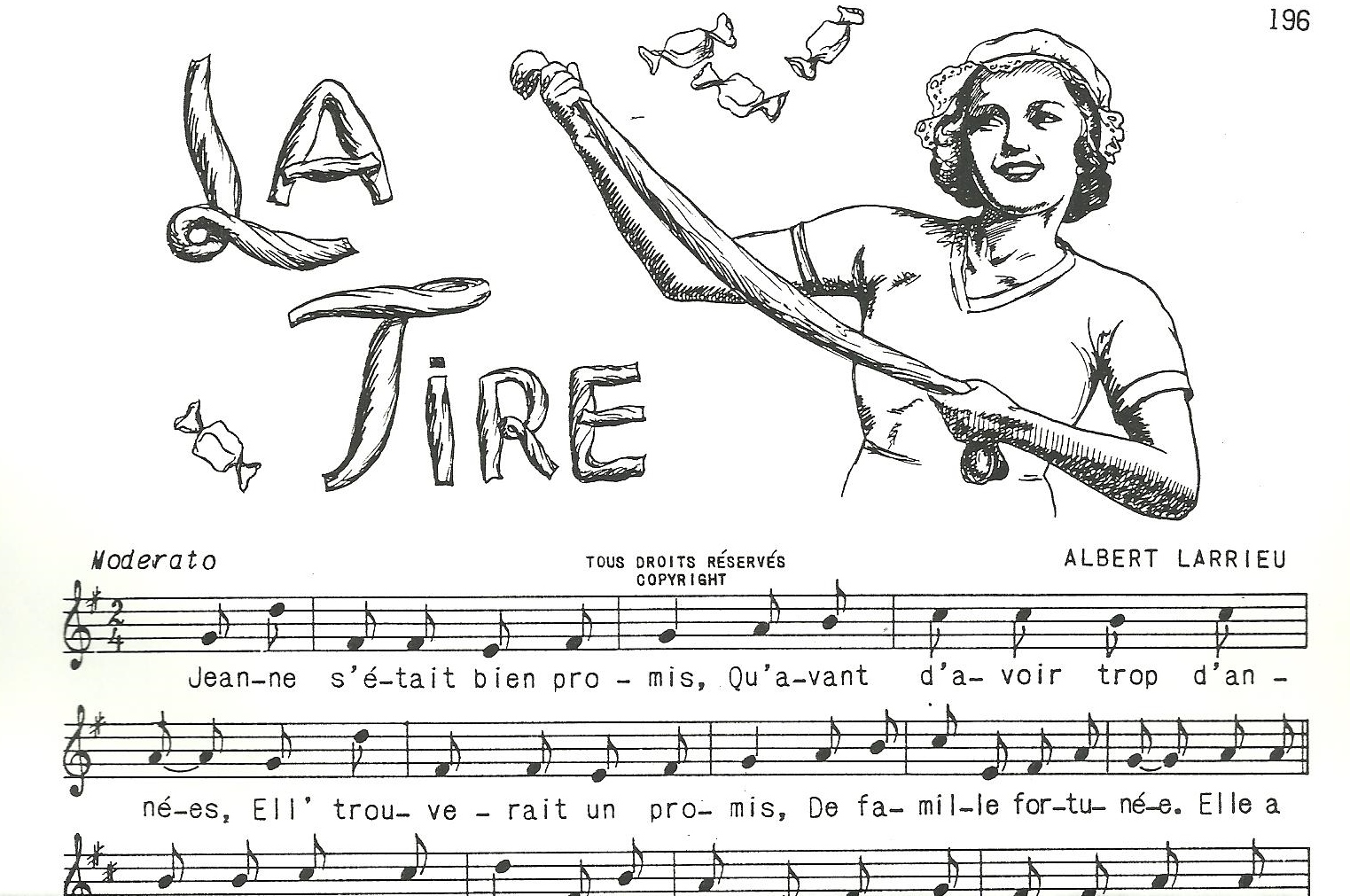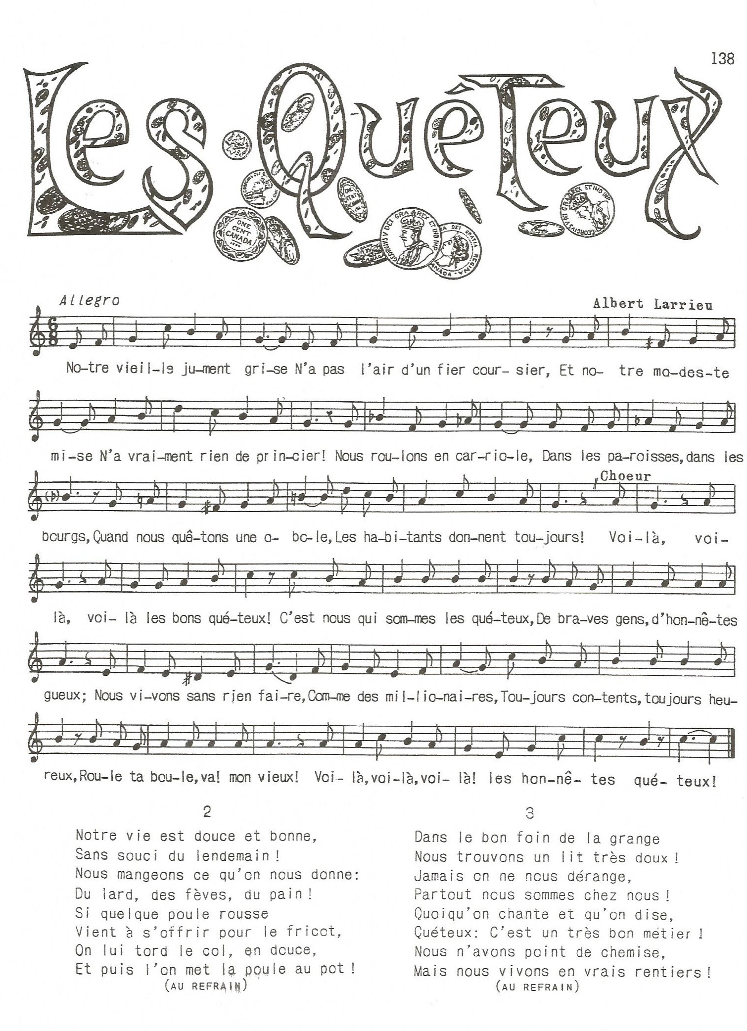 Parfois, pour changer, on faisait des « chansons de geste ». Je me souviens en particulier de deux de ces chansons : Comme ça et La Cantinière. Dans la première, comme il s’agit de la rencontre de « Majorique » et « Phonsine », c’est une chanson dialoguée, alors on divisait le chœur en deux parties qui se répondaient. Pour ce qui est de La Cantinière, c’est une chanson qui peut s’étirer à l’infini, exemple : « La Cantinière, a de beaux gants, de beaux bas, un beau chapeau », etc. On s’amusait beaucoup à inventer des paroles à ces chansons.