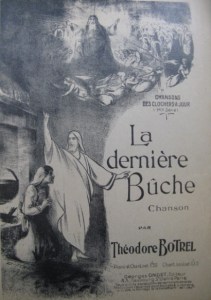 J’en viens à la très belle légende de Noël de Théodore Botrel, qui a pour titre : La dernière bûche. Je vous la résume, car cette chanson est composée de six couplets de neuf lignes chacun. C’est ce qu’on appelle un « duo mimé ». Les deux personnages se nomment Jean le Gueux et Jean Misère. La chanson commence ainsi :